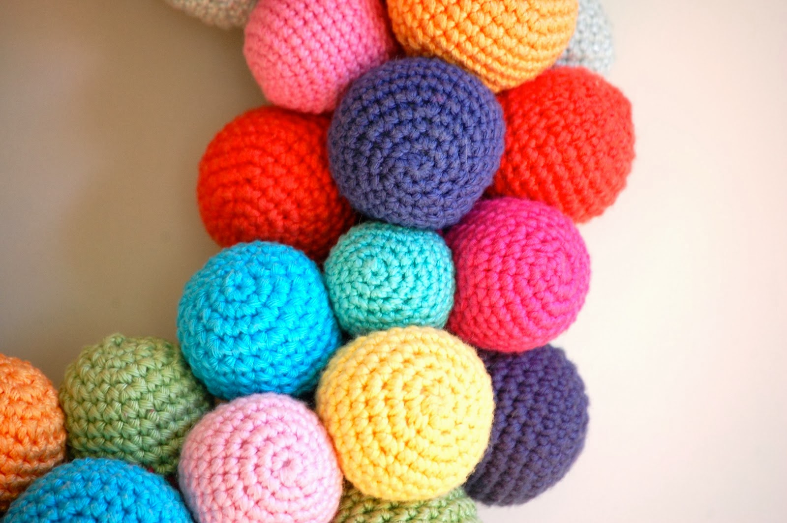E per decorare il vostro portone di casa realizzate una bellissima ghirlanda composta come tutti gli altri progetti in questo post con le palline colorate all'uncinetto. Una decorazione giusta per tutto l'anno. Si sta avvicinando Natale? Avvogli delle lampadine attorno la ghirlanda e goditi l'atmosfera delle feste.